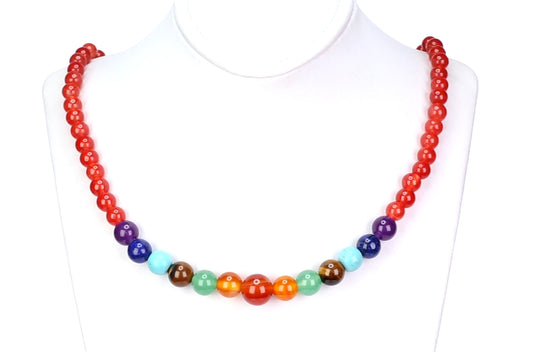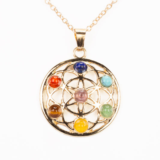 Colar Chakra de liga banhada a ouro com pedras: Cornalina, Ametista, Lápis-lazúli, Turquesa, Olho de tigre, Aventurina, Ágata laranja e Ágata vermelha
