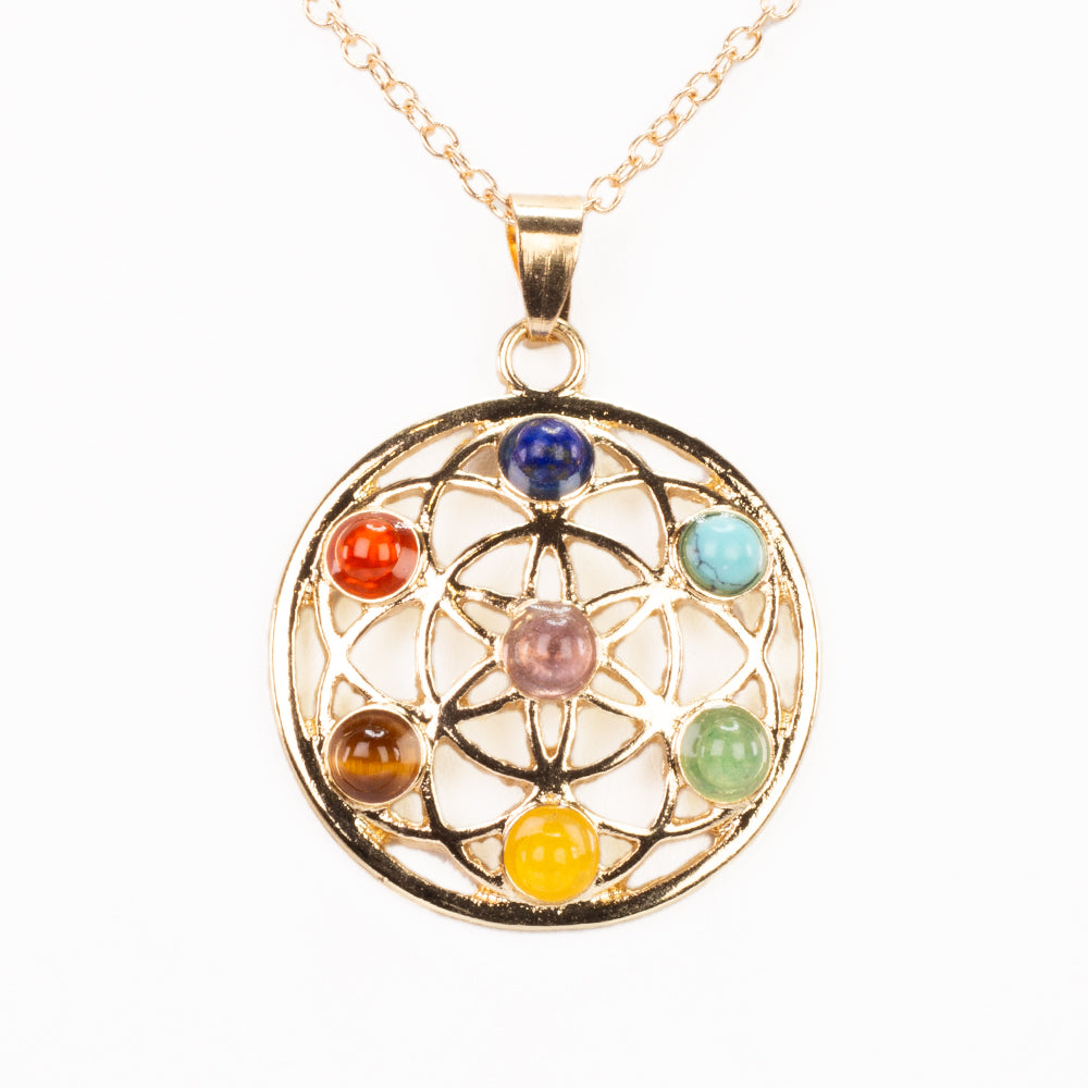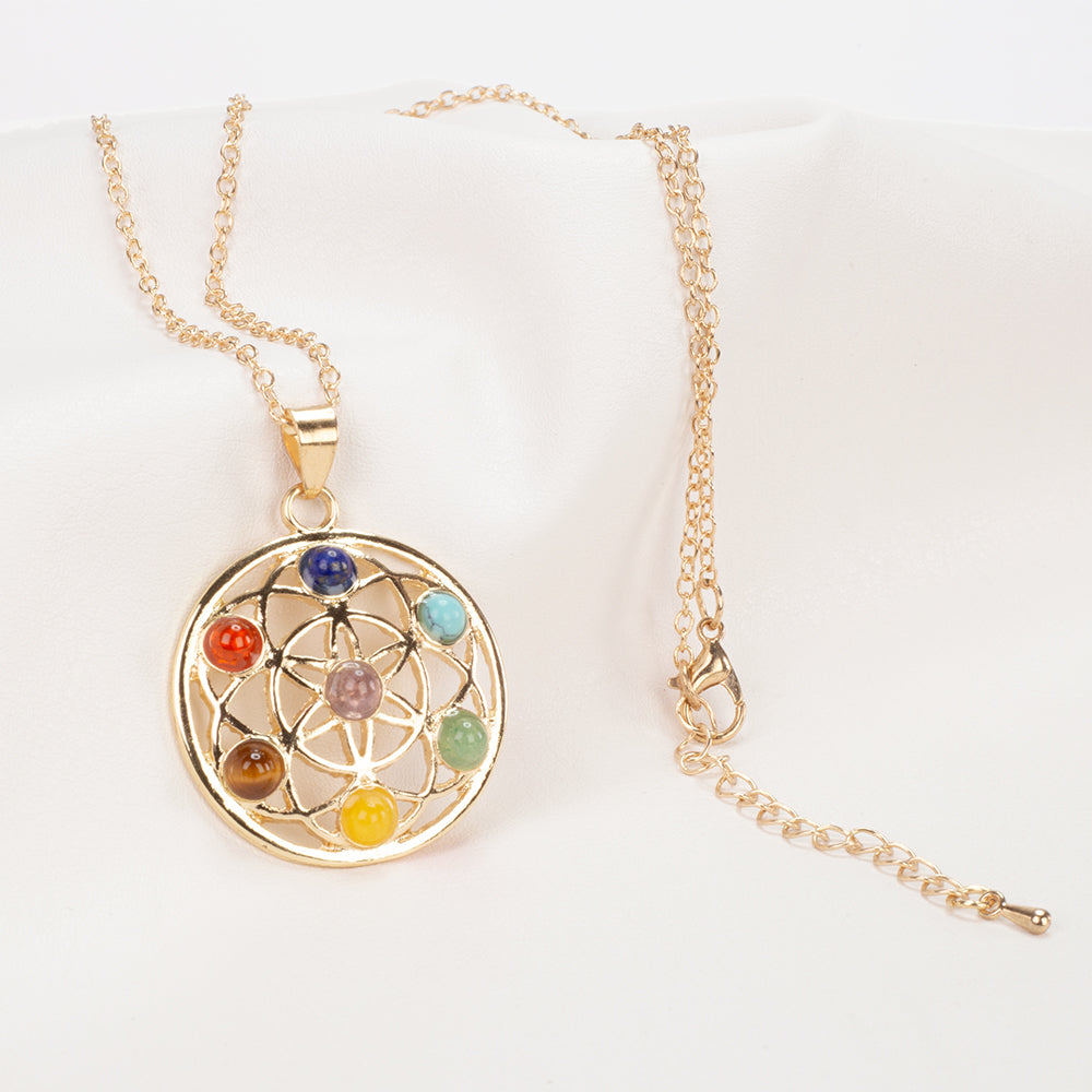 O pendente mostra a flor sagrada da vida, que simboliza a criação e a ligação de todos os seres vivos. As sete pedras do chakra embutidas no pendente representam os sete centros de energia do corpo, cada um dos quais corresponde a diferentes aspectos do nosso bem-estar físico, emocional e espiritual.