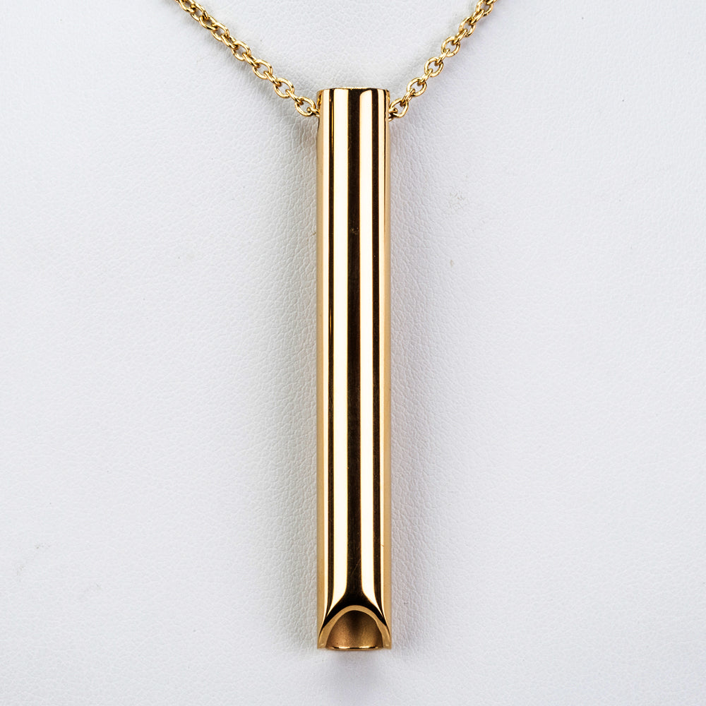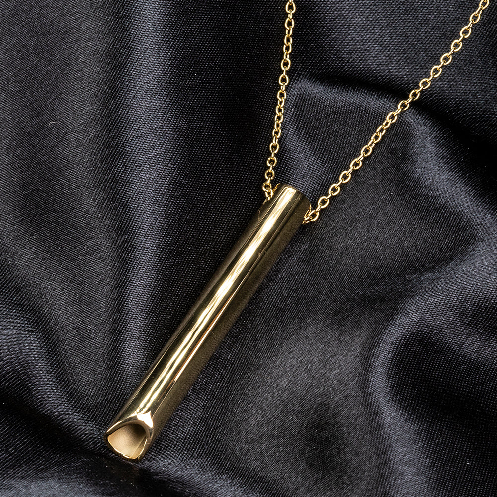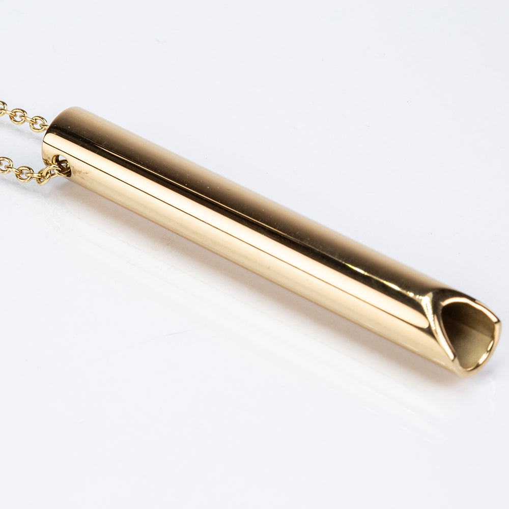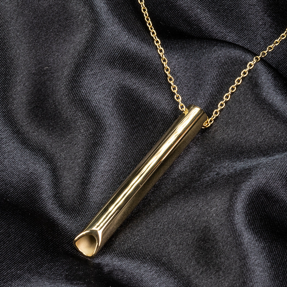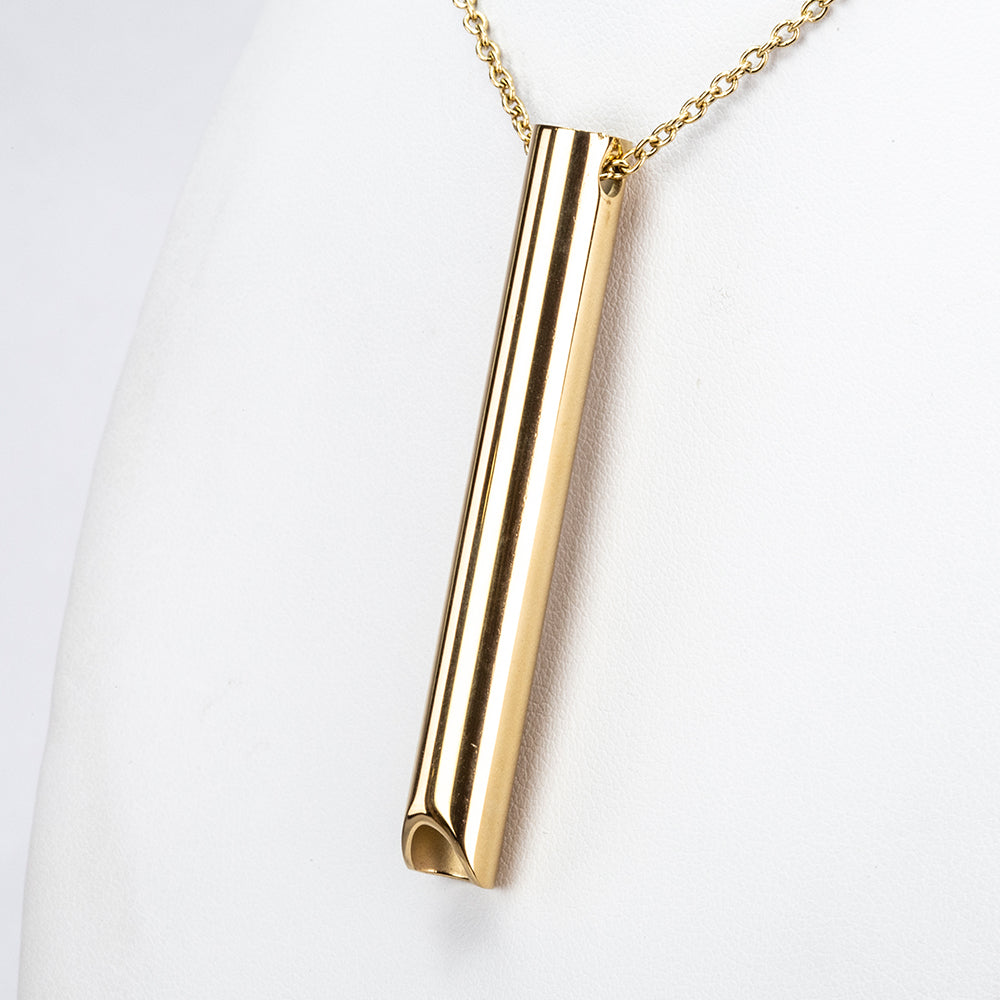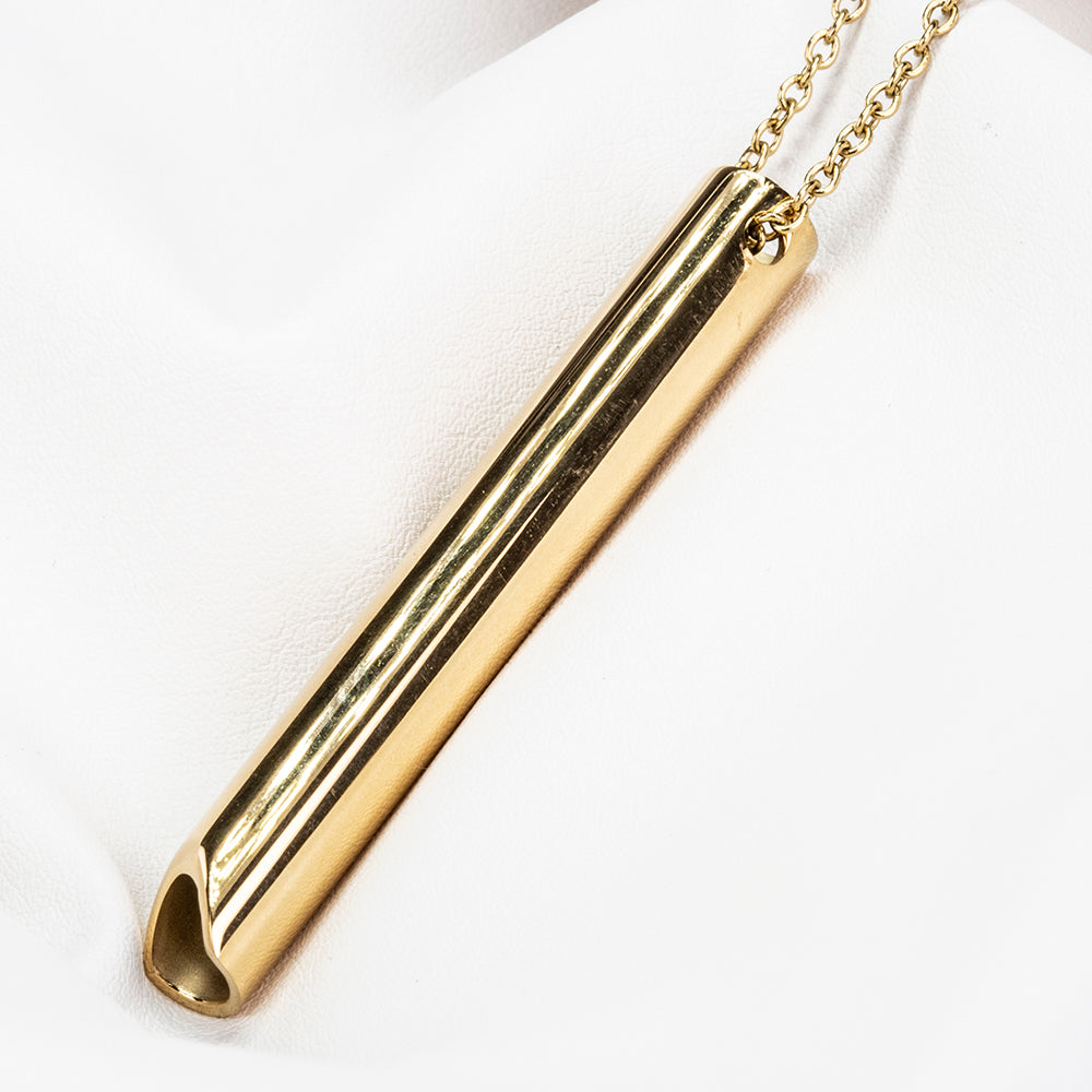 Este colar anti-ansiedade é um acessório elegante e útil para ajudar a reduzir o stress e a tensão do dia a dia. O pendente dourado não é apenas esteticamente agradável, mas também prático: ao soprar suavemente para dentro dele, pode conseguir uma respiração profunda e lenta que o ajuda a relaxar e a restaurar a harmonia interior. O aspeto simples e moderno permite-lhe usá-lo discretamente com qualquer roupa e tê-lo sempre à mão quando precisar dele em situações de stress.