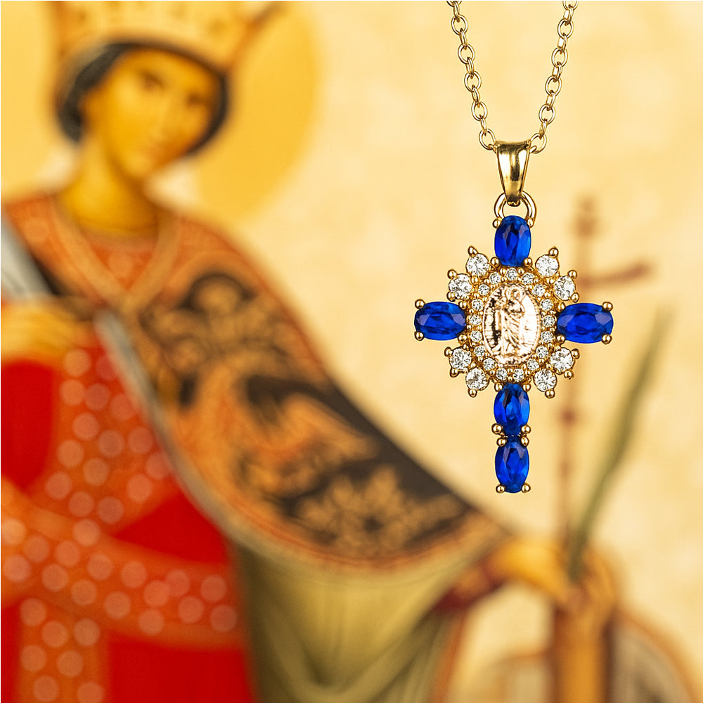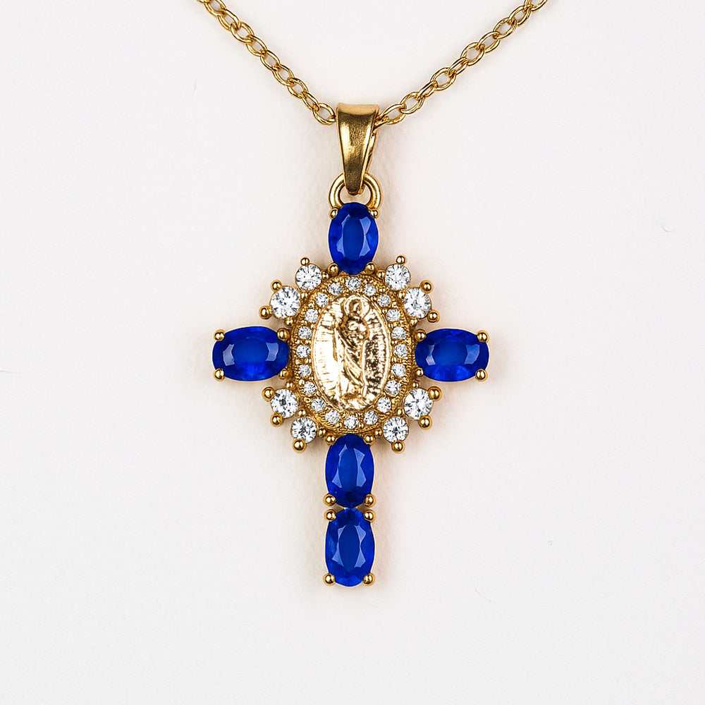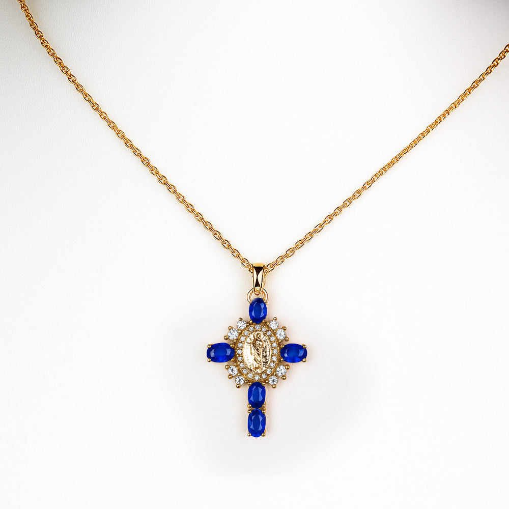 Este pendente único em forma de cruz é adornado com safiras azuis profundas, que simbolizam a sabedoria, a paz interior e a clareza. A Safira é uma das pedras mais preciosas, venerada há séculos como uma pedra de proteção espiritual e de busca da verdade.