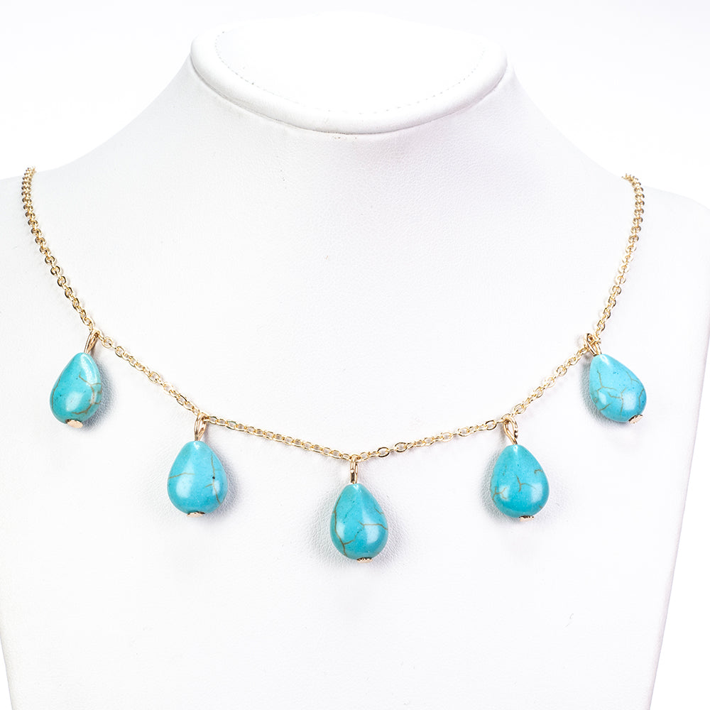 Se gosta de jóias de cortar a respiração, vai gostar da nossa oferta. Imagine um maravilhoso colar dourado decorado com pedras turquesa de cortar a respiração, e não apenas uma, mas 5 delas.